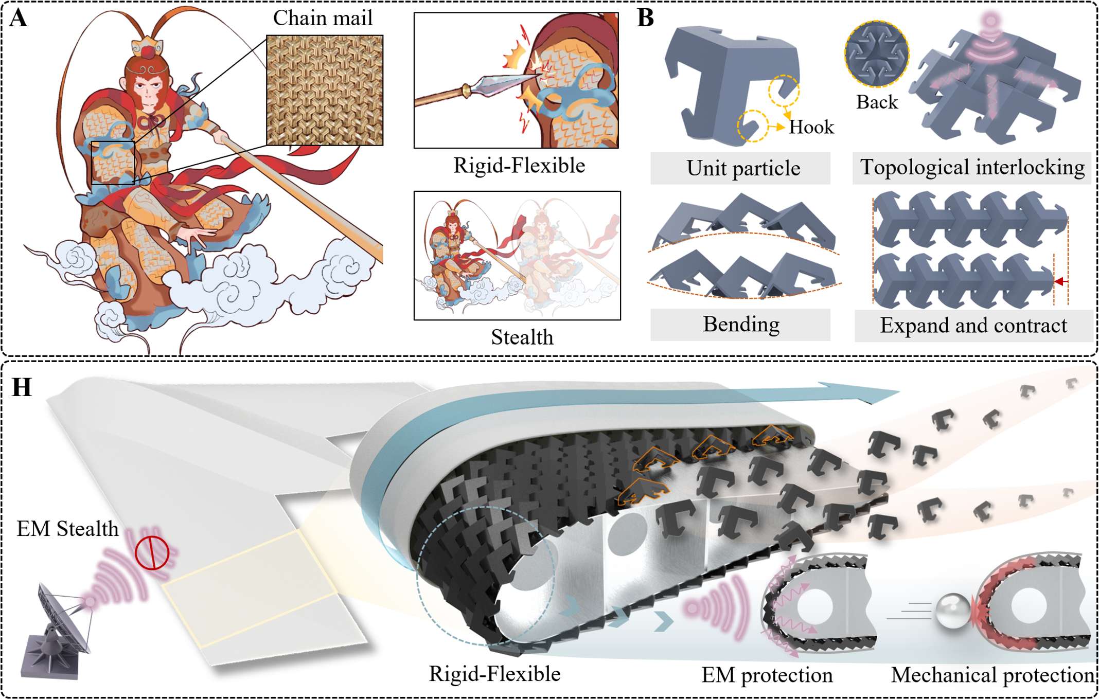 We present a chain mail-inspired stealth skin using topologically interlocking units, merging mechanical robustness with 2–40 GHz broadband absorption. This lightweight, conformable surface withstands damage and bending. Demonstrated on drones, it reduces radar cross-section by over 98%, establishing a versatile strategy for advanced aerospace applications. [Paper] |